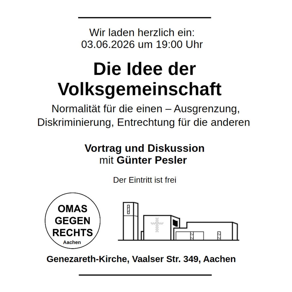 03.06.26, 19:00 Uhr: Vortrag zum Thema „Die Idee der Volksgemeinschaft“, Genezareth Kirche, Vaalser Straße 349, Aachen. Referent: Günther Pesler (Infos zum Referenten gibt es hier:
